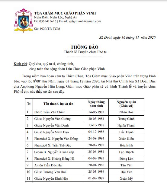Ngày 05/11/2020, Tòa Giám mục Giáo phận Hà Tĩnh có Thư rao số 32/2020/T-GM thông báo về việc Truyền chức Linh mục cho 14 thầy Phó tế thuộc Khóa XIII, Đại Chủng viện Thánh Phanxicô Xaviê.